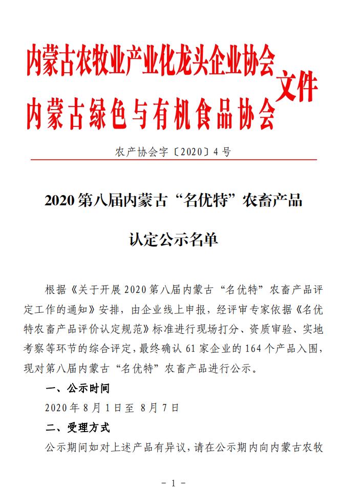 2020(第八屆)內(nèi)蒙古“名優(yōu)特”農(nóng)畜產(chǎn)品認定公示名單