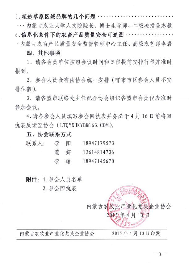 關(guān)于召開(kāi)內(nèi)蒙古農(nóng)牧業(yè)產(chǎn)業(yè)化龍頭企業(yè)協(xié)會(huì)第一屆第三次理事會(huì)暨會(huì)員代表大會(huì)的通知