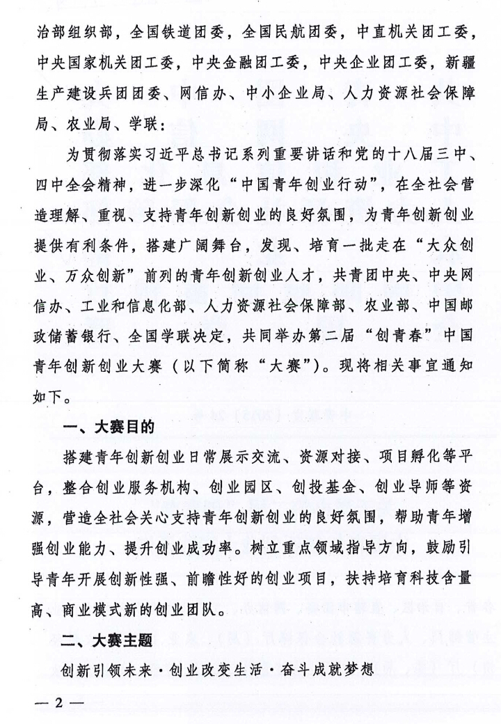關于舉辦第二屆“創(chuàng)青春”中國青年創(chuàng)新創(chuàng)業(yè)大賽的通知