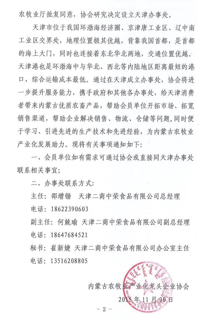 關(guān)于成立內(nèi)蒙古農(nóng)牧業(yè)產(chǎn)業(yè)化龍頭企業(yè)協(xié)會(huì)天津辦事處的通知