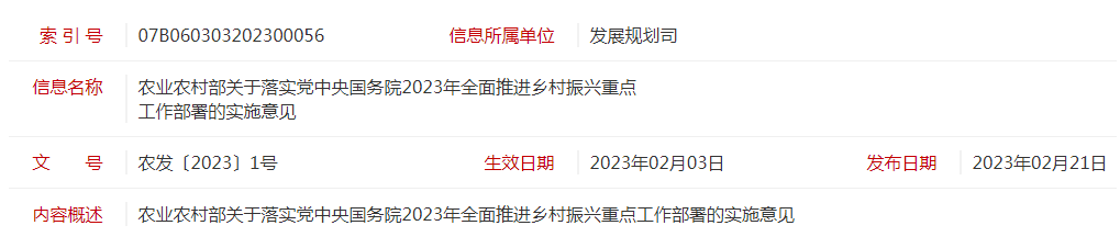 標(biāo)題:農(nóng)發(fā)〔2023〕1號(hào)農(nóng)業(yè)農(nóng)村部關(guān)于落實(shí)黨中央國(guó)務(wù)院2023年全面推進(jìn)鄉(xiāng)村振興重點(diǎn)工作部署的實(shí)施意見