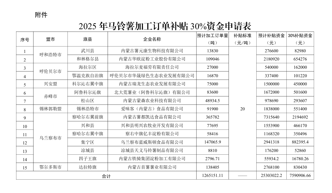 按照《內(nèi)蒙古自治區(qū)農(nóng)牧廳關(guān)于印發(fā)2025年馬鈴薯加工訂單補(bǔ)貼項(xiàng)目實(shí)施方案的通知》(內(nèi)農(nóng)牧加工發(fā)〔2025〕305號(hào))要求,經(jīng)盟市組織申報(bào)、實(shí)地核查、公示,自治區(qū)復(fù)核,現(xiàn)將2025年相關(guān)盟市上報(bào)的馬鈴薯加工訂單補(bǔ)貼30%資金申請(qǐng)情況予以公示,公示期為15天。如對(duì)公示有異議,請(qǐng)及時(shí)向自治區(qū)農(nóng)牧廳反映。